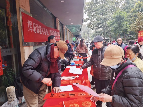 活动现场墨香四溢、暖意融融。书画家们凝神挥毫、笔走龙蛇,一幅幅寓意吉祥的春联、一个个饱含福气的“福”字跃然纸上,作品兼具艺术美感与新春意涵,深受居民欢迎。大家围站一旁,品评墨迹、挑选心仪的春联福字,现场欢声笑语不断,处处洋溢着欢乐祥和的节日氛围。社区书法爱好者还与书画家们现场交流切磋,在笔墨互动中感受传统书法的独特魅力,共话文化传承。